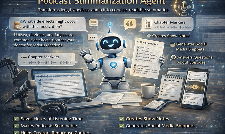 The Podcast Summarization Agent transforms lengthy audio content into concise, readable summaries, key takeaways, and timestamped highlights. It transcribes podcast episodes, identifies main topics, extracts notable quotes, highlights guest insights, and creates structured summaries with chapter markers. The agent can generate show notes, pull actionable advice, create social media snippets, and even answer specific questions about episode content. It handles multiple speakers, accents, and audio quality levels while maintaining context and nuance. Perfect for podcast producers, content marketers, researchers, and busy listeners who want to review content quickly, this tool saves hours of listening time, makes podcasts searchable and accessible, and helps creators repurpose audio content across multiple formats.